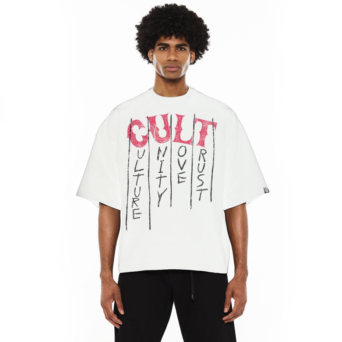 The CULT Boxy Fit Short Sleeve Crew Neck "C.U.L.T" Tee 625B9-K32A in white is crafted to combine contemporary style and comfort. Its boxy fit provides a modern silhouette that drapes naturally, while the crew neck design ensures a classic, versatile neckline suitable for layering or standalone wear. Made with quality materials, this tee offers durability and softness, ideal for everyday use. The bold "C.U.L.T" lettering adds a distinctive edge, making it an excellent choice for those seeking both casual style and statement appeal in their wardrobe. Perfectly suited for pairing with jeans or shorts, it balances fashion and function effortlessly.
