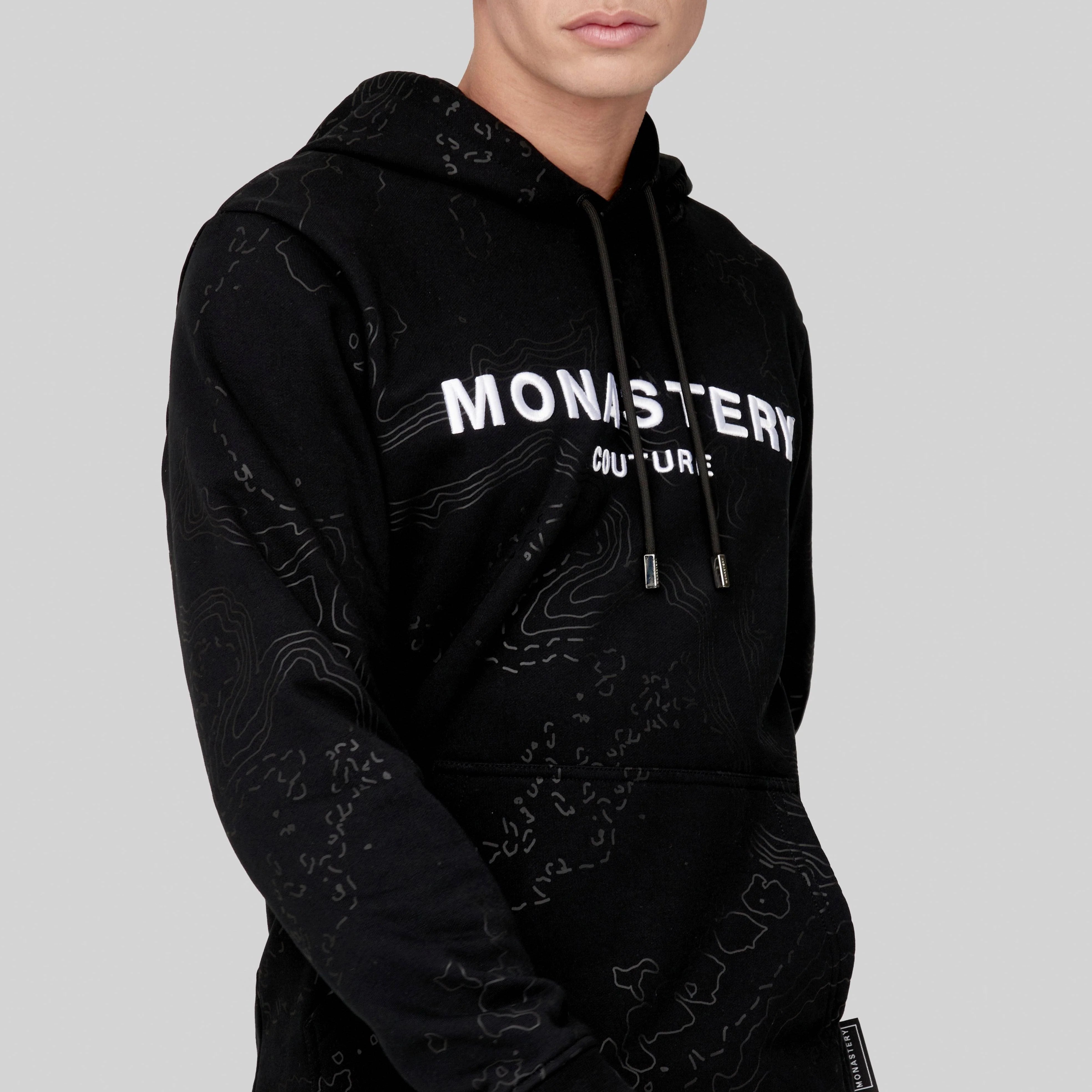 Nuestra sudadera Jerjes, con bolsillo tipo canguro, presenta el texto "Monastery Couture" bordado en el centro sobre un elegante diseño topográfico. En el interior de la capota, podrá apreciar un color en contraste que le aporta un toque distintivo. La base textil es 100 % algodón peruano, lo que garantiza una calidad excepcional. Además, esta sudadera tiene una silueta regular, diseñada para realzar la figura masculina.