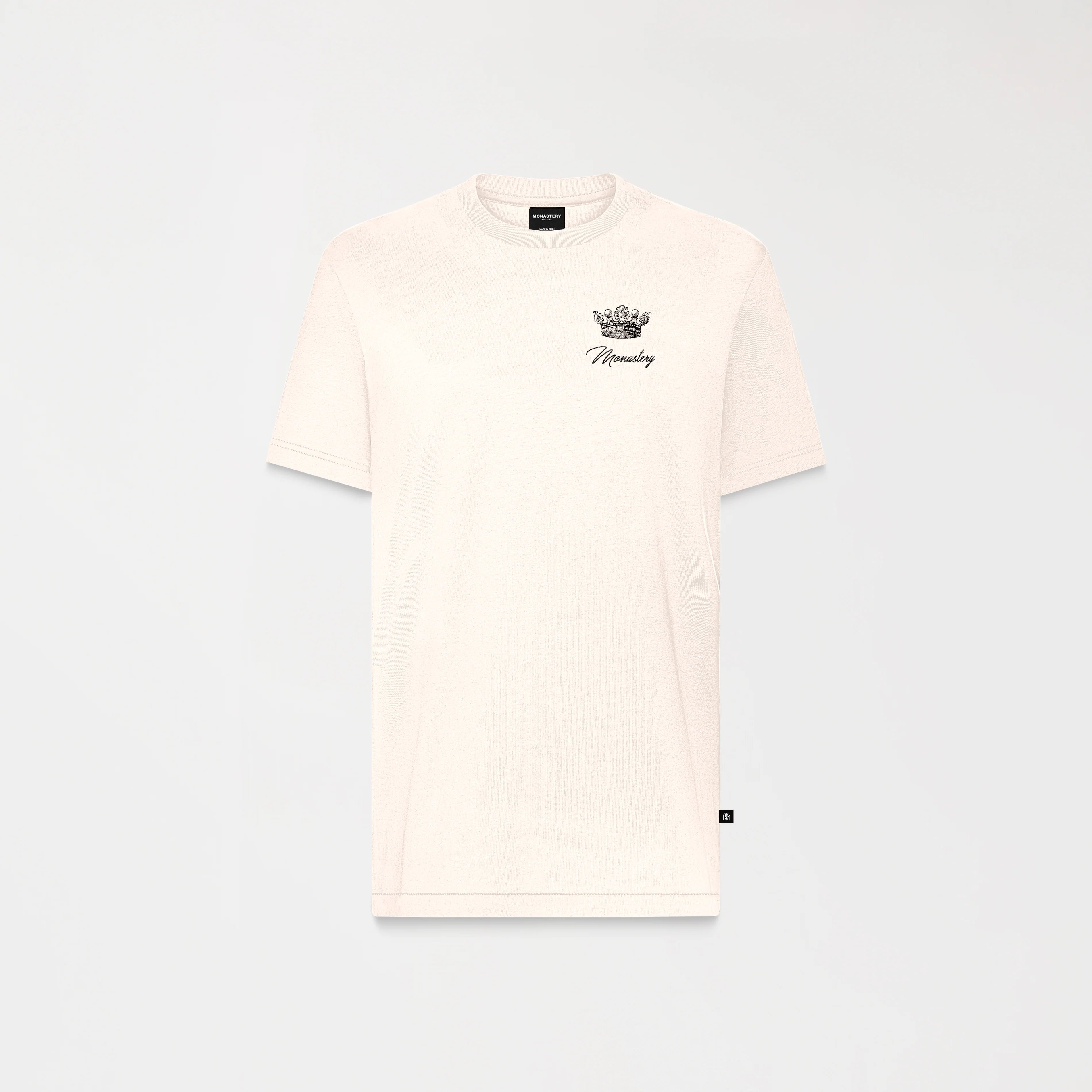 Camiseta para hombre 100 % algodón, exclusiva para Monastery, confeccionada en corte regular con cuello de 2,5 cm. Presenta una corona con el logotipo de Monastery en puntada de corazón y la imagen de Monastery The King en la espalda, realizada con una técnica de puntada plana de alta densidad. Warsel es una prenda con un arte icónico renovado, lo que la hace fácilmente reconocible y muy versátil para combinar con tu armario.