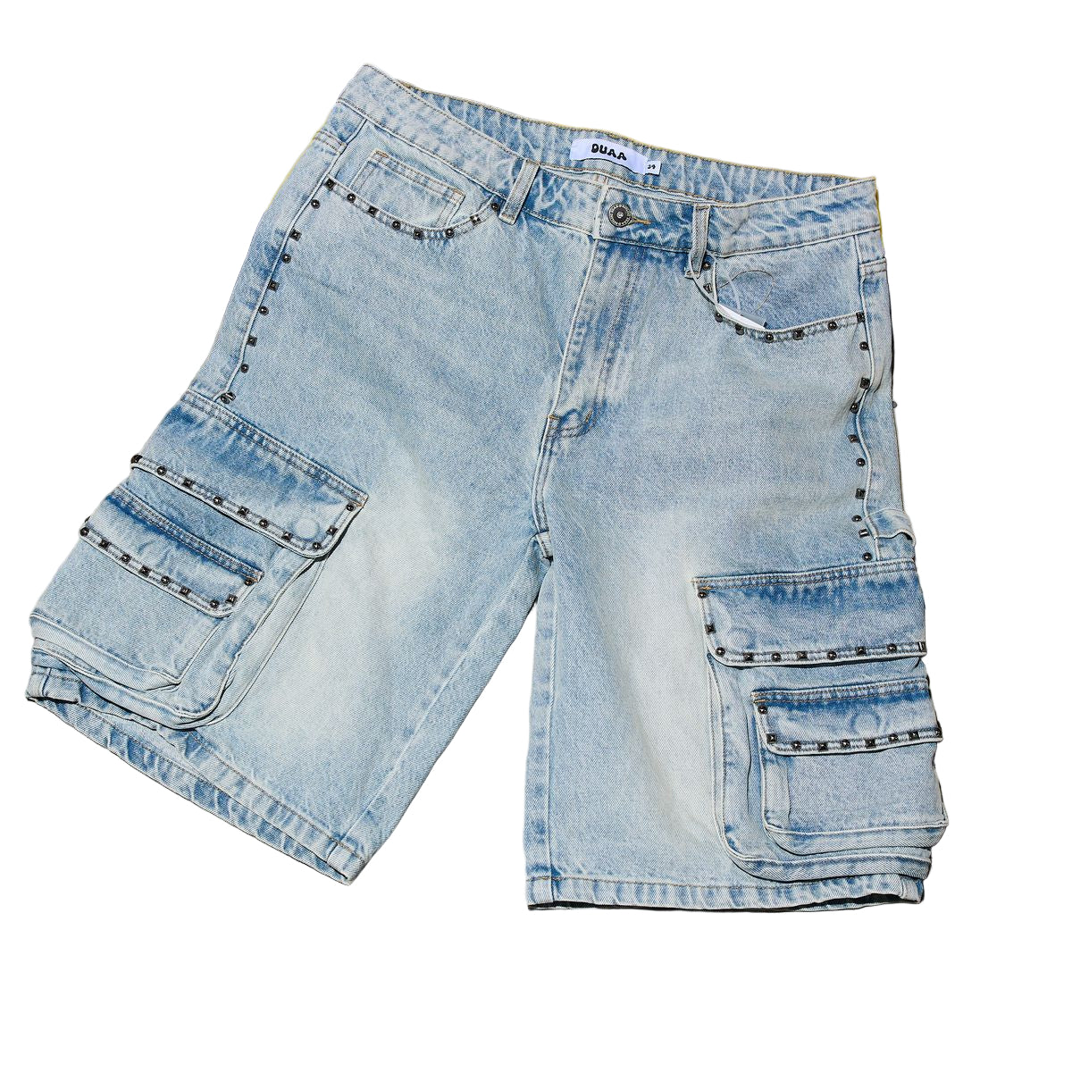 The Duaa ''Noble'' blue cargo denim shorts feature a nostalgic blue wash. Two utility pockets on each side. And with an attention to detail gun metal stud pattern around the seems of the short, in a two shape pattern.