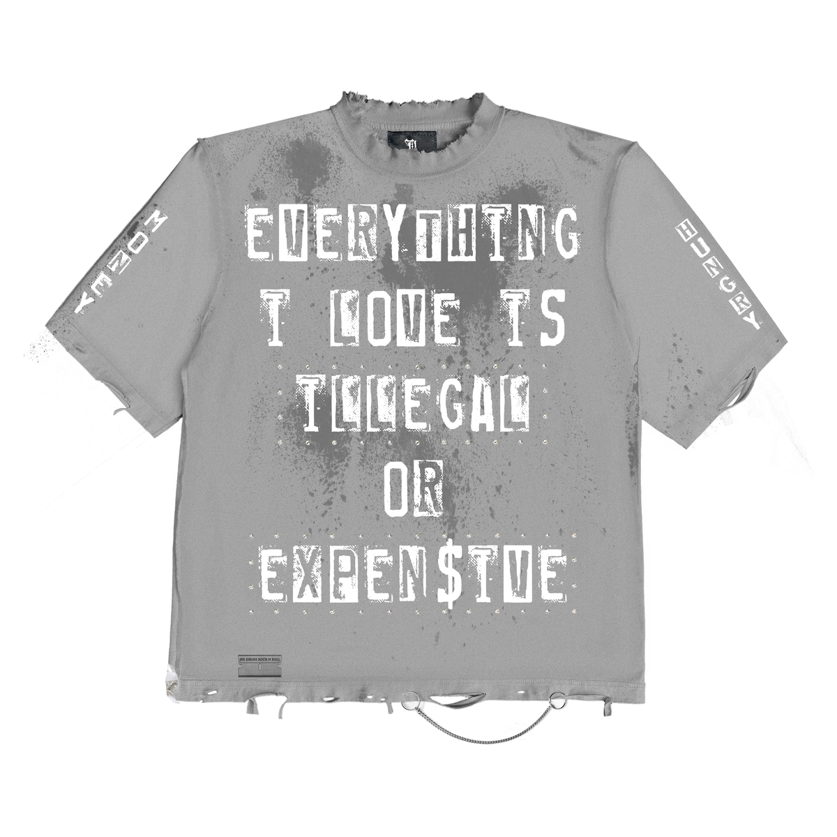 "Crafted from premium heavyweight cotton, this "EVERYTHING I LOVE" tee features hand-shredded detailing that delivers authentic streetwear edge. The distressed design balances luxury construction with bold aesthetic appeal, making it a standout piece for curated collections and statement-driven fits. Grey colorway pairs effortlessly with premium sneakers and layering pieces.