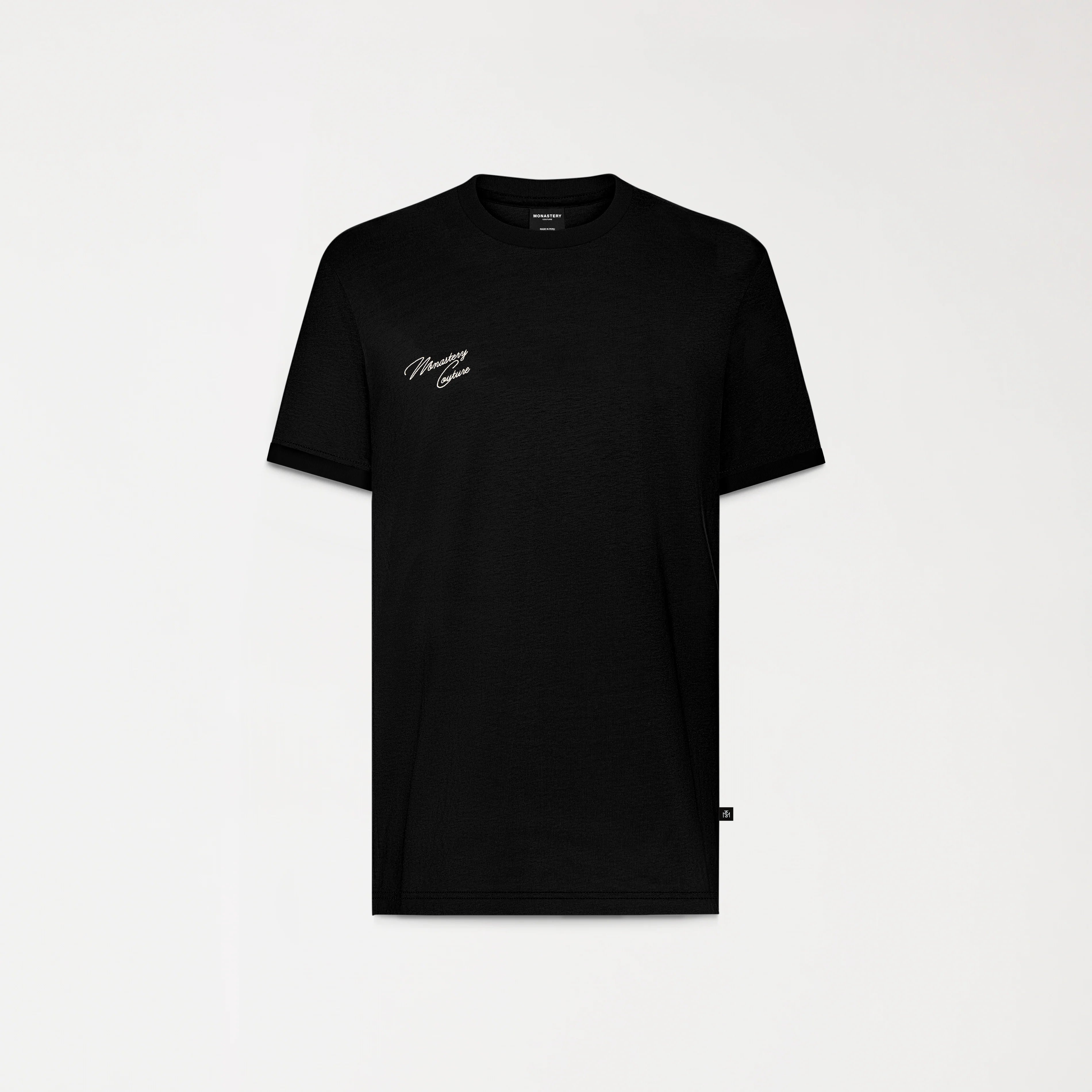 La combinación de telas de esta camiseta proporciona un ajuste cómodo y transpirable, mientras que el elegante diseño negro la hace perfecta para cualquier ocasión.