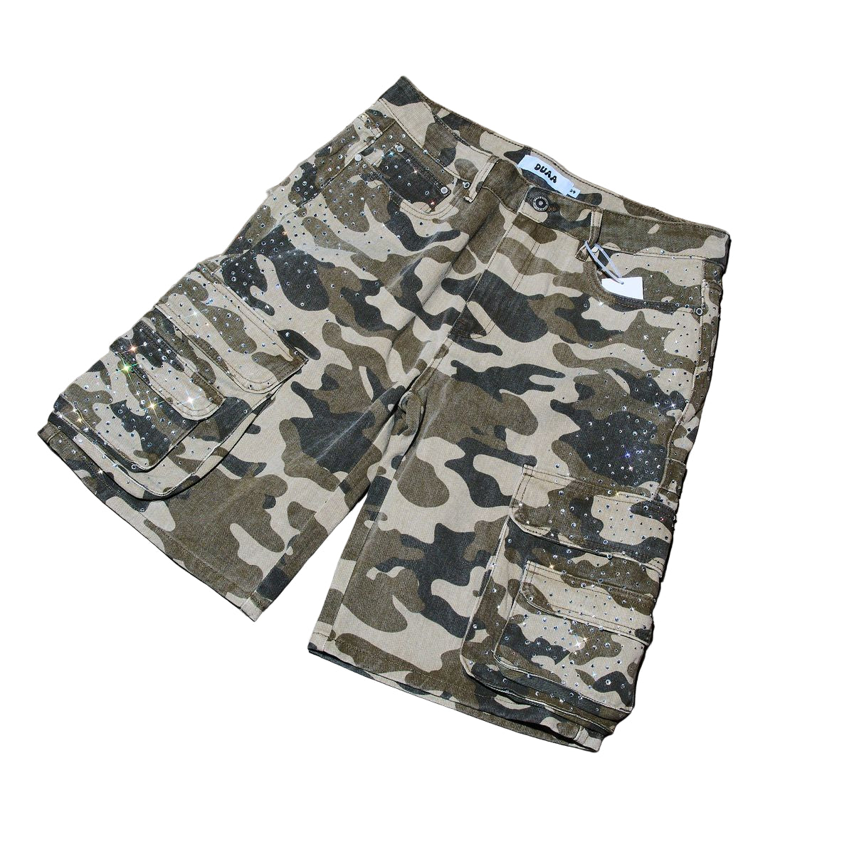 The Duaa creative green camo cargo shorts feature a washed vintage camouflage pattern, Two utility pockets on each side. with a subtle clear stone pattern on the side.
